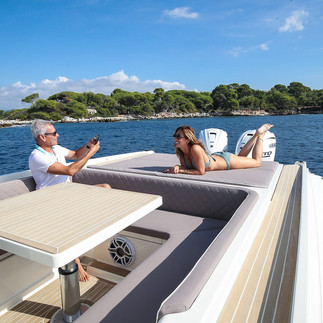 The open stern features a large sunbathing area, maximizing relaxation space. However, this design requires careful footing to avoid stepping on the upholstery when boarding. While the layout is aesthetically pleasing, it demands a bit of practicality.