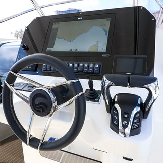 The layout of the Tempest 42 is carefully designed to maximize space and comfort. At the stern, generous swim platforms serve as bathing areas, with integrated ladders and retractable cleats. These details not only enhance the aesthetics of the boat but also increase its functionality, making movement on board easier. The Digital Electric Steering from Yamaha is a major innovation, eliminating the need for cylinders, pumps, and hoses, simplifying maintenance while offering smoother, more precise control.